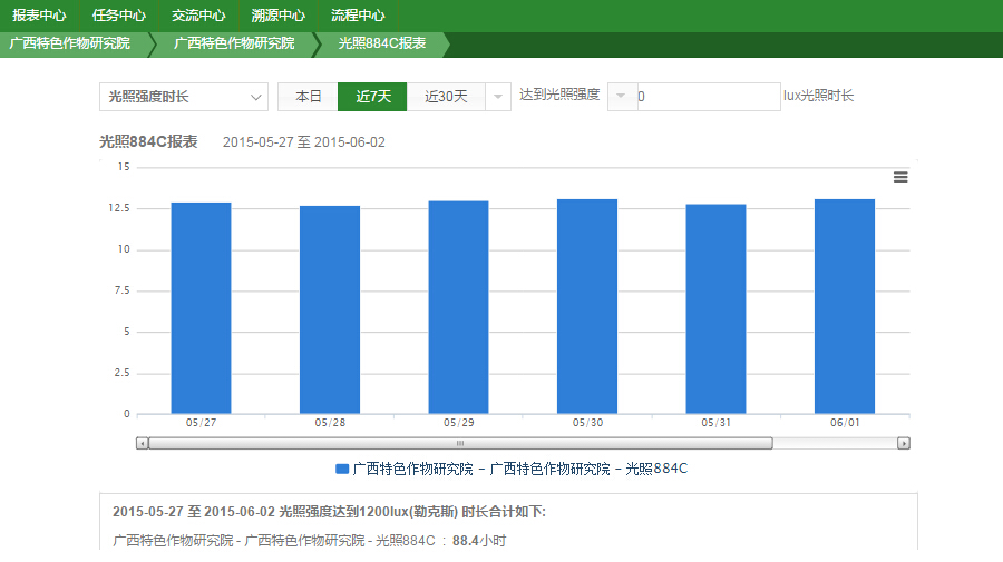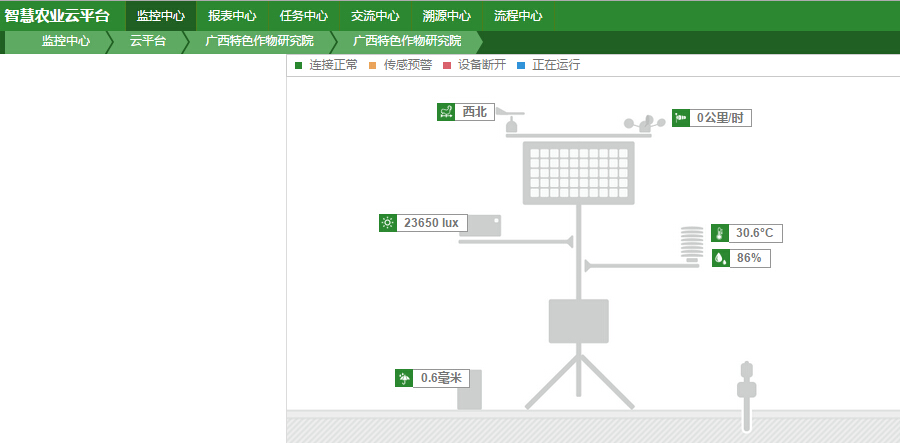 對(duì)于農(nóng)業(yè)科研工作而言,對(duì)一線(xiàn)數(shù)據(jù)如作物生長(zhǎng)環(huán)境數(shù)據(jù)(光照、降雨量、土壤溫濕度、空氣溫濕度)、作物生長(zhǎng)過(guò)程數(shù)據(jù)進(jìn)行采集、分析,是非常重要的工作。為了更好開(kāi)展科研工作,2013年始,廣西特色作物研究院借助天潤(rùn)智力智慧農(nóng)業(yè)云平臺(tái)智能農(nóng)業(yè)監(jiān)控系統(tǒng),進(jìn)一步加強(qiáng)對(duì)作物基礎(chǔ)數(shù)據(jù)的采集分析,以使科研工作更科學(xué)精準(zhǔn)。