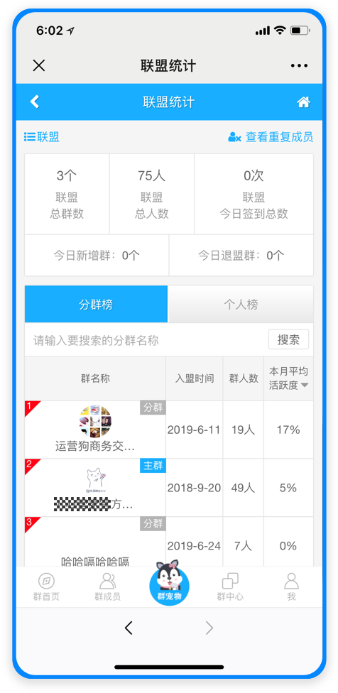 | 多群數(shù)據(jù)分析 | 多群數(shù)據(jù)對(duì)比:活躍度、發(fā)言數(shù)、總?cè)藬?shù)、簽到數(shù)、邀請(qǐng)數(shù)、退群數(shù)等;個(gè)人數(shù)據(jù)對(duì)比:簽到數(shù)、發(fā)言數(shù)、邀請(qǐng)數(shù)排行等 |