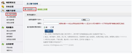 1.創(chuàng)建賬號:請點擊“員工賬號管理”,將賬號批量導(dǎo)入,創(chuàng)建郵箱賬號,如下圖: