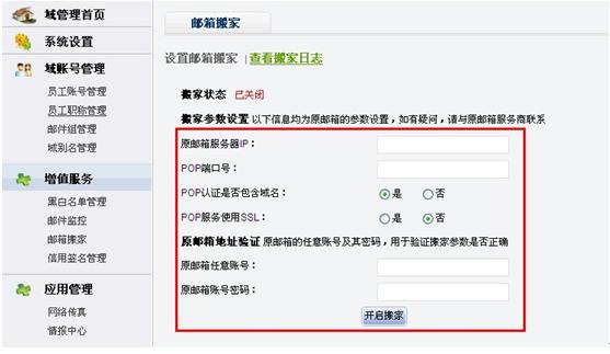 填寫搬家信息后點擊“開啟搬家”,郵箱搬家功能便開啟成功。
