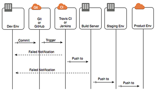工程在開發(fā)環(huán)境進(jìn)行簡(jiǎn)單的提交前檢查,如靜態(tài)分析和簡(jiǎn)單的測(cè)試,然后提交到代碼托管服務(wù),通過Code Review后合并入庫(kù),進(jìn)行完整的自動(dòng)測(cè)試,最后根據(jù)需要發(fā)布到測(cè)試或生產(chǎn)環(huán)境。